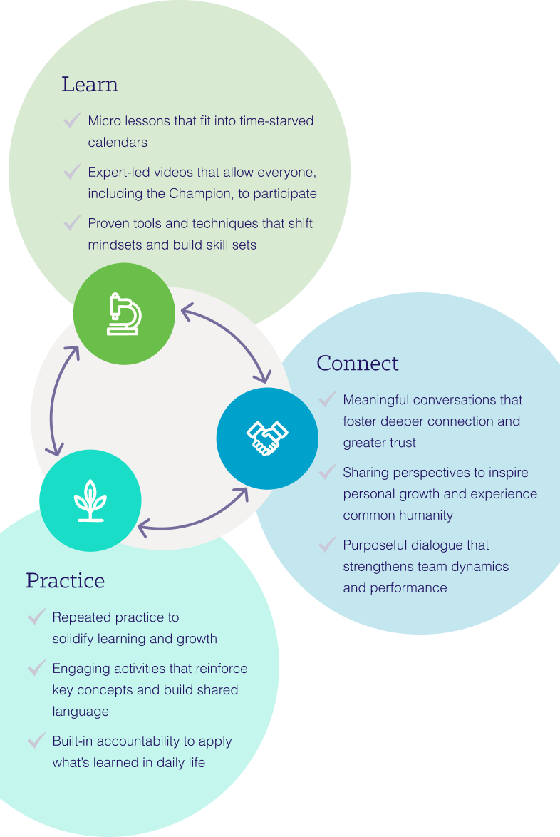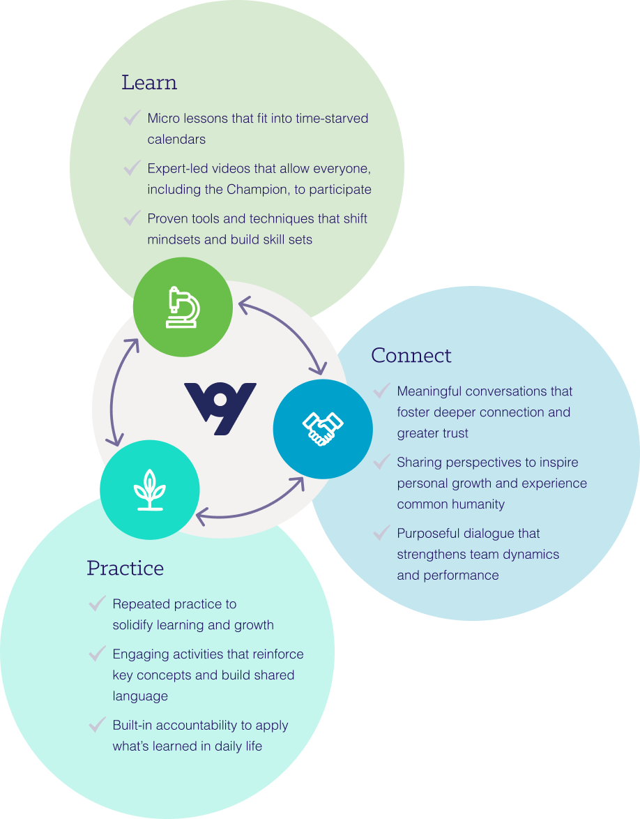 BetterYet is team-based learning that starts with your leaders. Your group of BetterYet Champions is certified by Positive Foundry. With minimal preparation each week, your Champions will lead their teams through a repeated cycle of learning, connecting, and practicing Skills to Thrive.