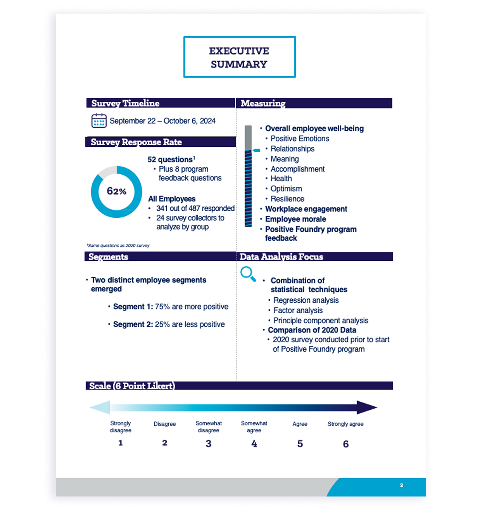 Positive Foundry offers a complimentary 6-minute survey with any of our programs to measure individual well-being and employee morale, which is completed both before the program lanch and after program completion. This enables us to measure program impact and provide your team with tangible results, helping you quantify your training investment.